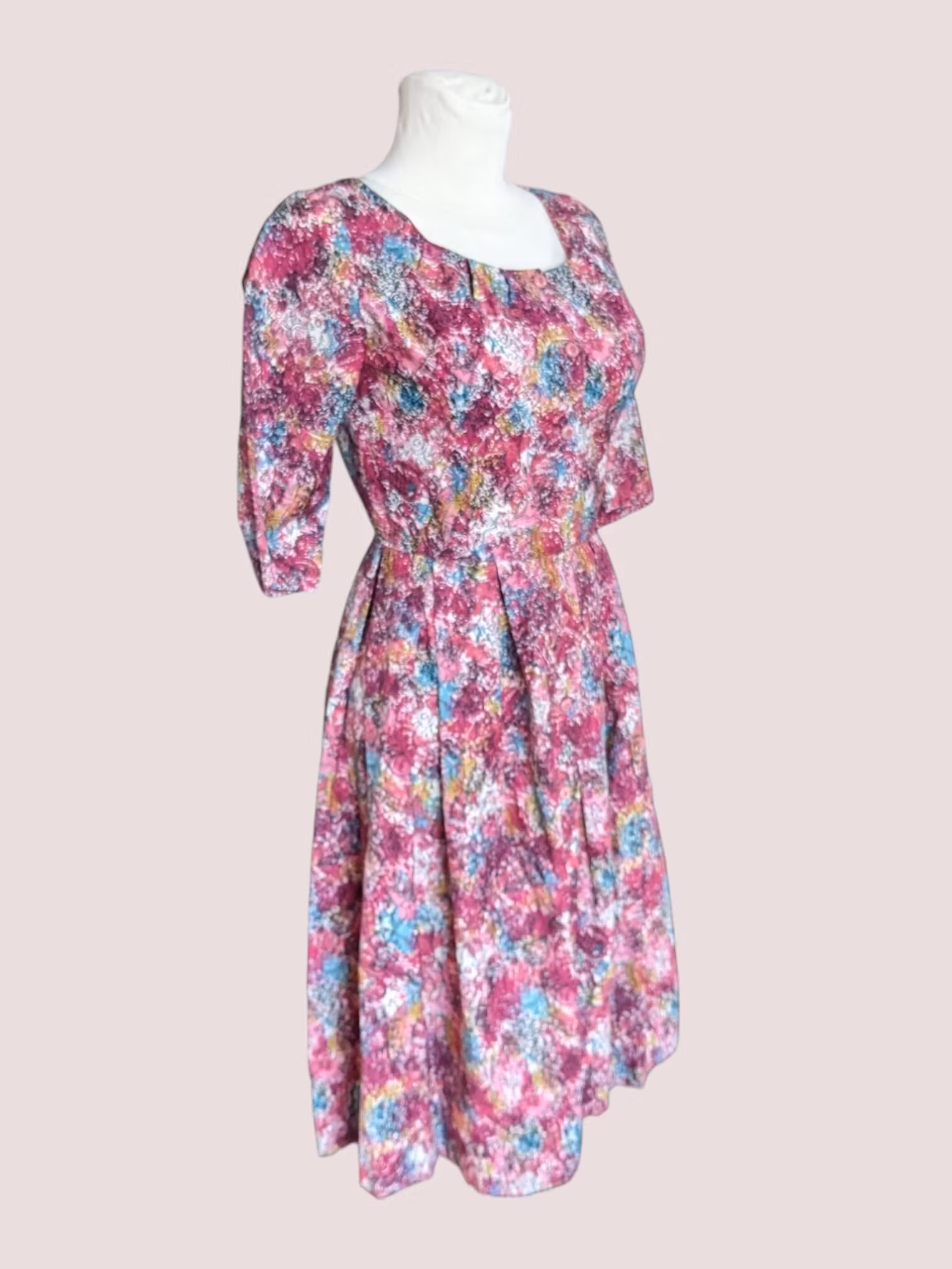 Vintage kjole fra Danske Reybro 1950'erne Str.36 - Brystmål 82 - Længde 98 - Materiale ukendt (føles som bomuld) Grade B - er på tidspunkt blevet lagt op